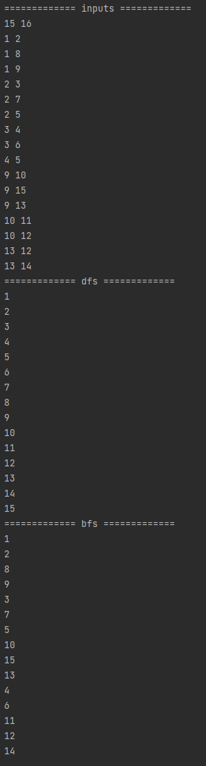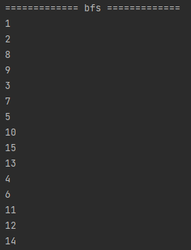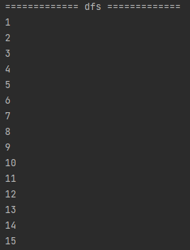 일부러 제가 노드를 dfs 기준 순서대로 맞춰놓았기 때문에 1~15가 순서대로 출력되는 것을 알 수 있습니다.