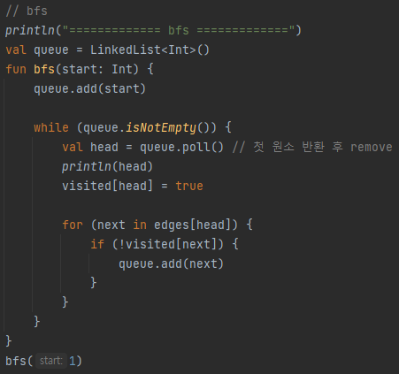 BFS는 큐(Kotlin에서는 LinkedList)와 while+for문으로 구현합니다.