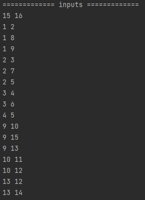 인풋 제일 첫 줄은 vertex의 개수, edge의 개수입니다. 그 다음 줄부터는 edge들이 어디랑 어디가 연결되어있는지에 대한 정보들입니다.