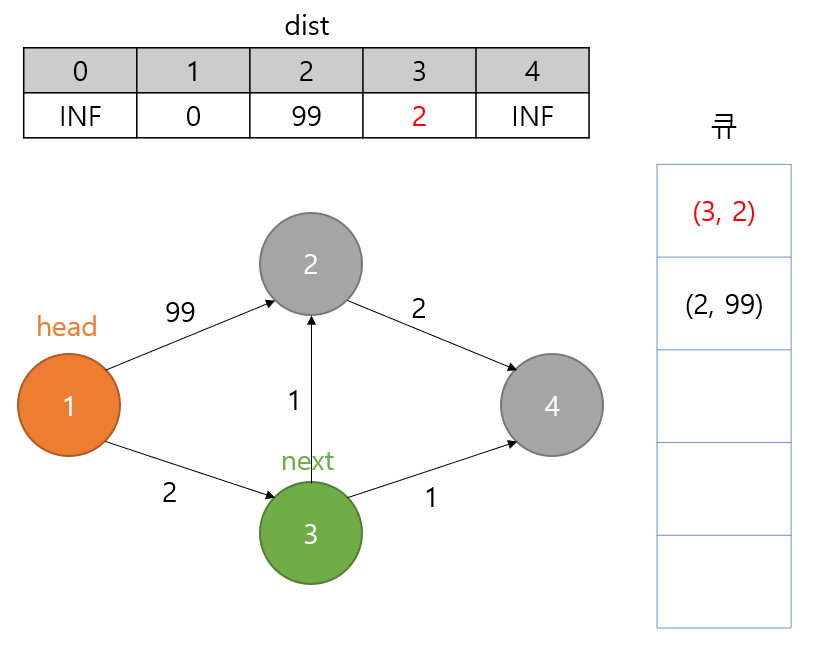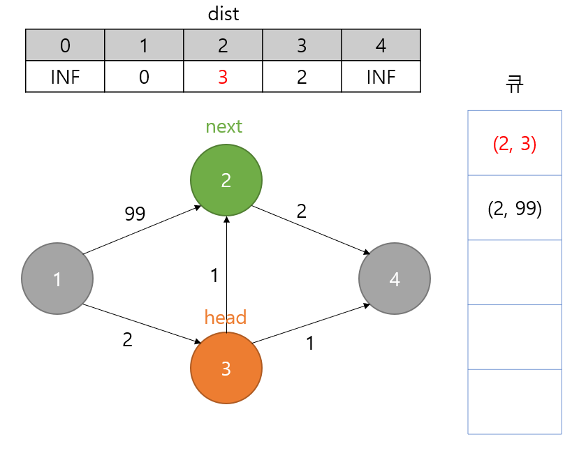 이렇듯 이미 큐에 (2, 99)가 있는데 똑같은 노드 번호이면서 더 낮은 비용의 (2, 3)이 큐에 들어오는 경우엔 (2, 99)가 head로 튀어나왔을 때 dist[2] != head.second인 상황이 발생하는 거죠.