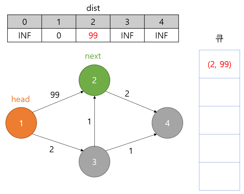 dist[2]를 INF에서 99로 새롭게 갱신합니다.