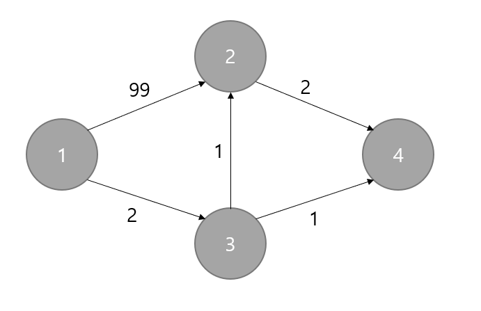기존 dist[2]가 99였는데 dist[3]에서 1을 더한 것, 즉, 3번을 거쳐서 2번으로 가는 게 비용이 훨씬 저렴합니다.