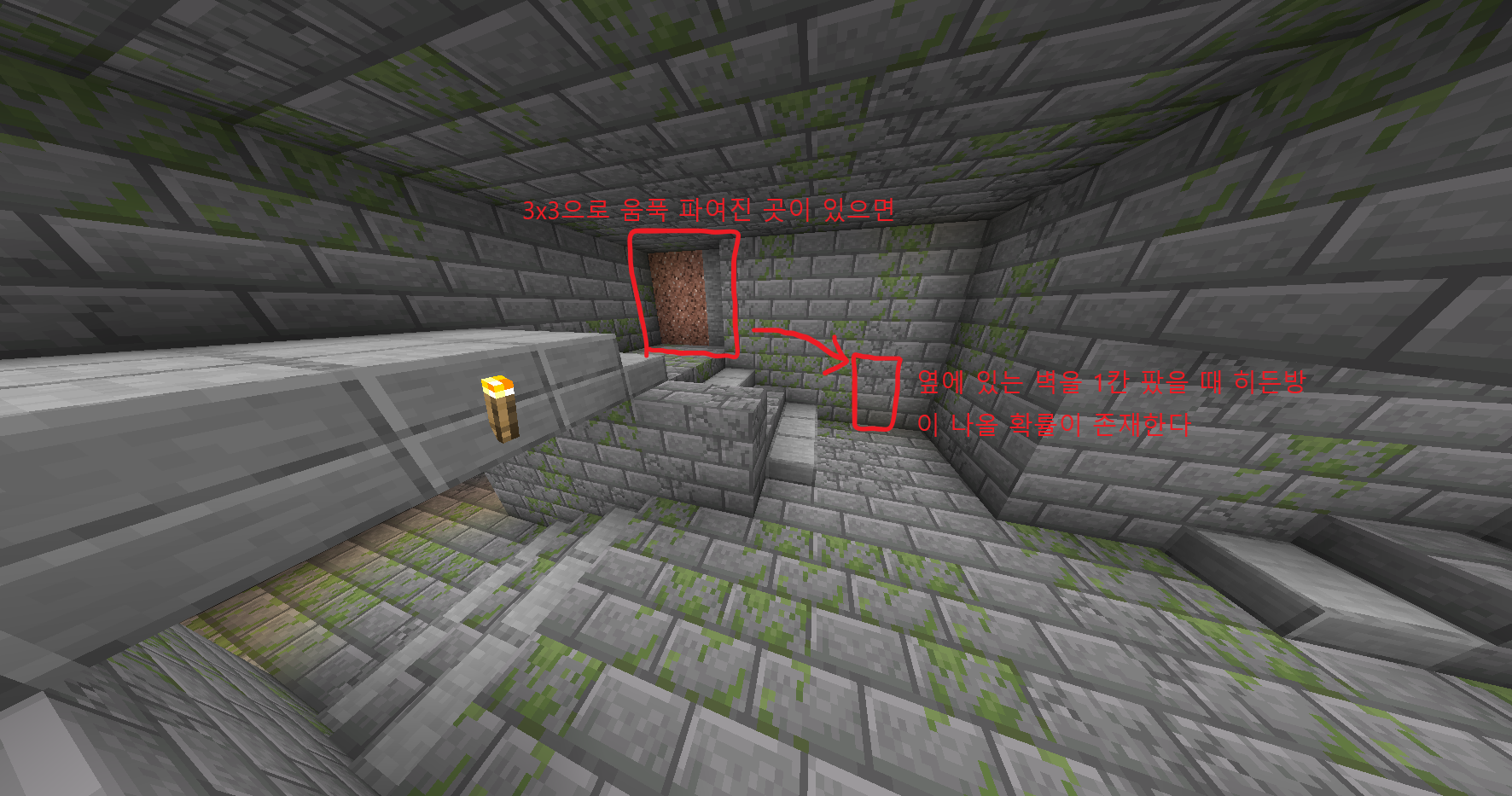 만약 이렇게 왼쪽 아래 벽이 움푹 파져있었으면 왼쪽 윗부분을 팠을 때 히든 방이 나올 확률이 있습니다.
