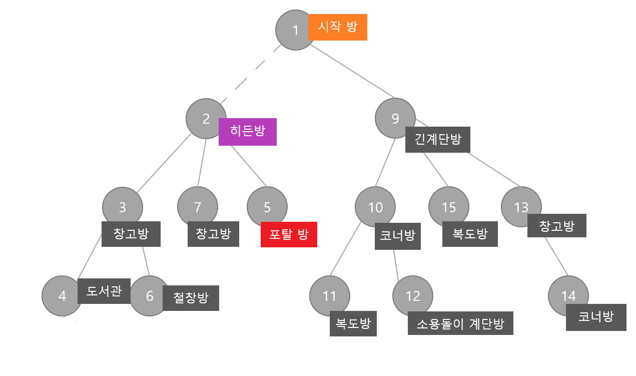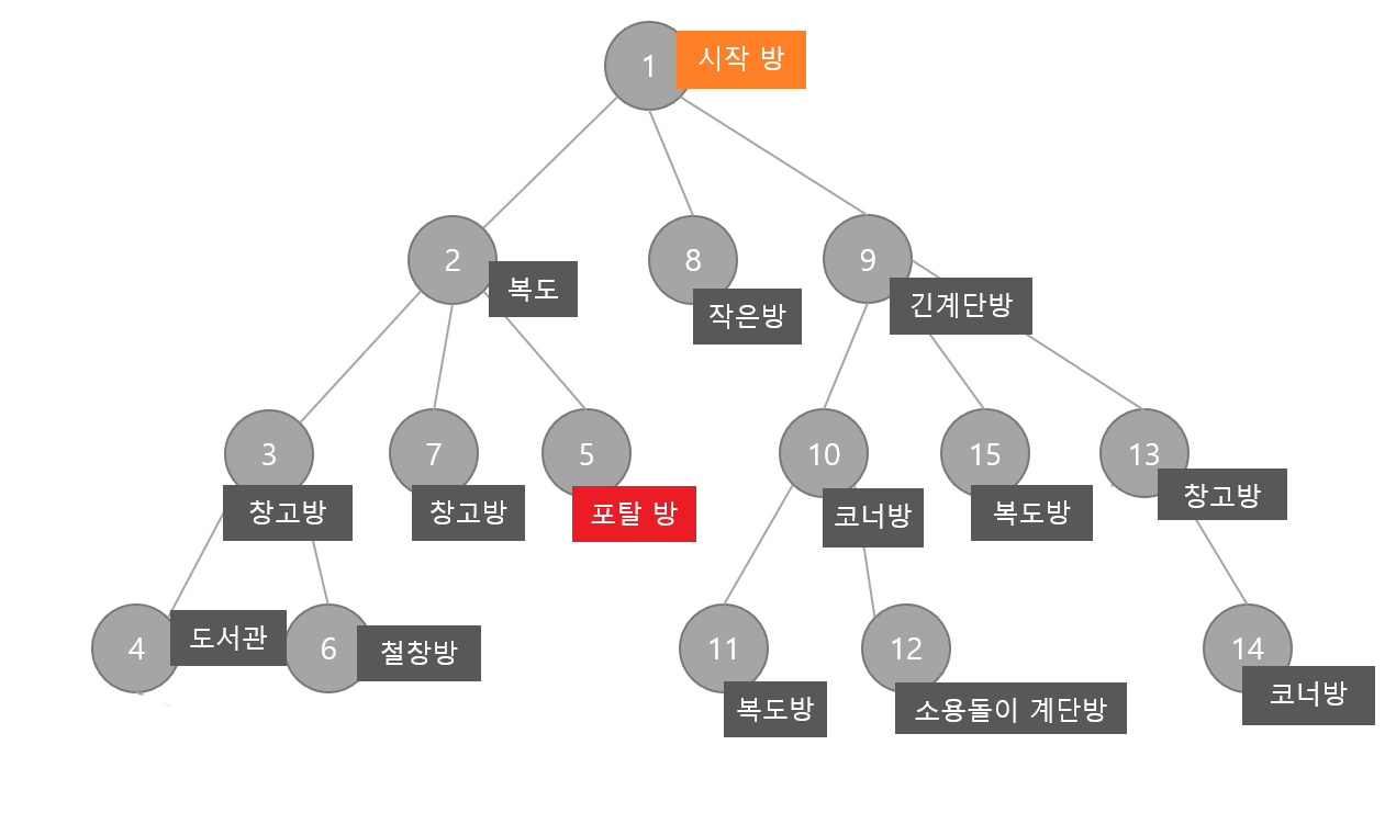 시작 방에서 지하 계단으로 내려가는 순간이 바로 위 그림에서 9번 노드로 가는 것과 같으며, 9번 노드 아래에 있는 그 어떤 방을 다 찾아봐도 포탈 방은 절대 안 나오는 거죠.